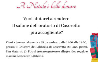 A Natale è bello donare. 18 dicembre dalle 11:00 alle 18:00 Chiostro dell’Abbazia di Casoretto Domenica 18 dicembre, dalle 11:00 alle 18:00, presso il Chiostro dell’Abbazia di Casoretto, ci [...]