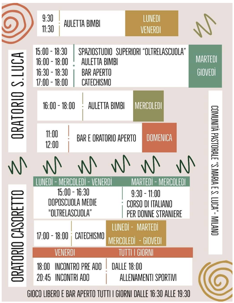 Martedì e giovedì presso la parrocchia di San Luca, via Jommelli 4 dalle 15 alle 17.30 spazio studio (a seconda delle necessità: recupero in rapporto 1:1, studio in piccolo gruppo, studio in autonomia, sempre sotto la supervisione di adulti competenti). Dalle 17 alle 18.30 attività, gioco, relax in oratorio.
